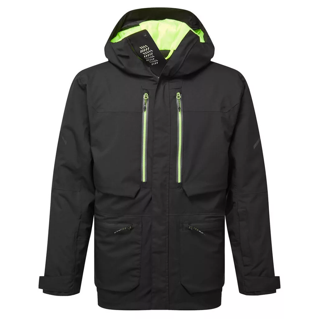 Oldalsó, zippzáros zsebek. Zippzáras zseb mellkason. Ujjzseb belső zsebek a biztonságos tárolásért, zsinórral állítható szegély,